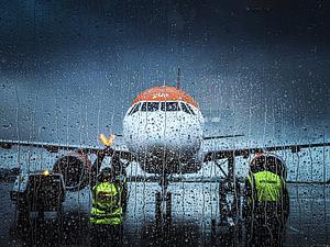 Plane sits on tarmac in the rain
